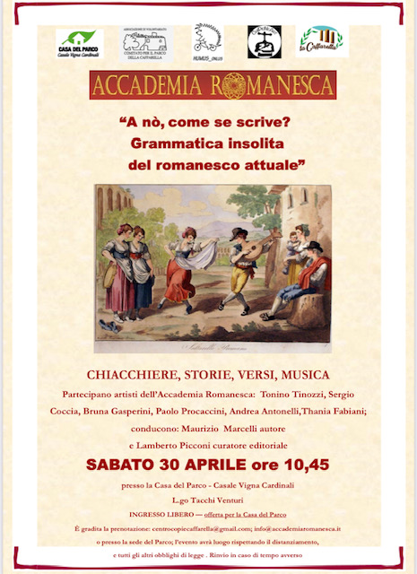 Sabato 30 aprile presso lo spazio di Vigna Cardinali "la Casa Del Parco della Caffarella", l'Accademia Romanesca ha offerto un paio d'ore di cultura all'aria aperta: canzoni, poesie, teatro in dialetto romanesco.